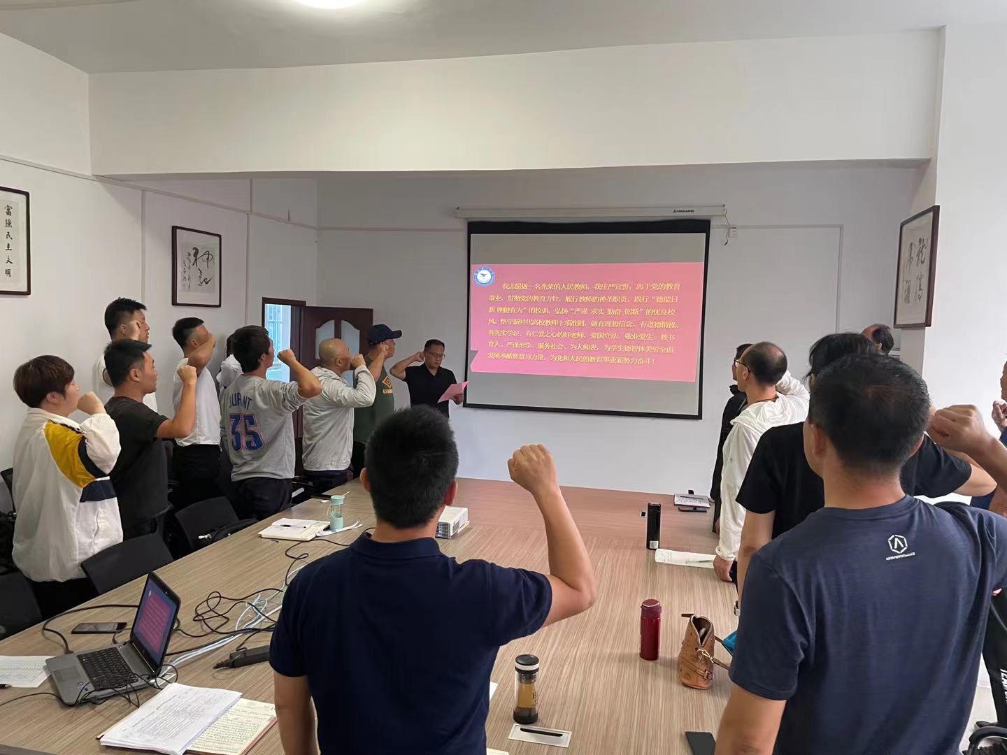 在张建主任的带领下全体教师庄严宣誓:“我志愿做一名光荣的人民教师,我庄严宣誓:忠于党的教育事业,贯彻党的教育方针,履行教师的神圣职责,践行“德能日新刚健有为”的校训,弘扬“严谨求实勤奋创新”的优良校风,恪守新时代高校教师十项准则,做有理想信念、有道德情操、有扎实学识、有仁爱之心的好老师,爱国守法、敬业爱生、教书育人、严谨治学、服务社会、为人师表,为学生德智体美劳全面发展奉献智慧与力量,为党和人民的教育事业而努力奋斗!”