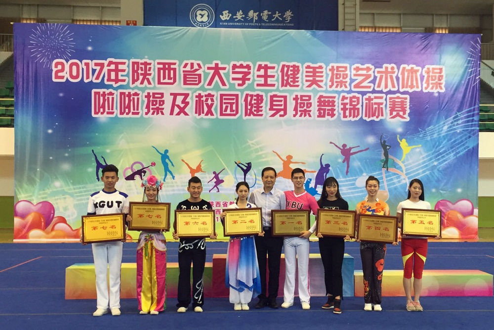 在强手如林的激烈角逐中,我校健美操代表队与西安邮电大学、西安科技大学、西安外国语大学、西北政法大学、西安工程大学及西安美术学院等多所院校同场竞技,他们不畏强手、敢于拼搏,取得了骄人的战绩:排舞(规定)、排舞(串烧)分获第一名;2016民族健身操之傣族健身操获得第三名;有氧舞蹈自编套路获得第四名;2017全国校园踏板规定动作共派出两支队伍,分别获得第三名和第五名,并获得甲组团体(本科院校组)总分第六名的战绩。