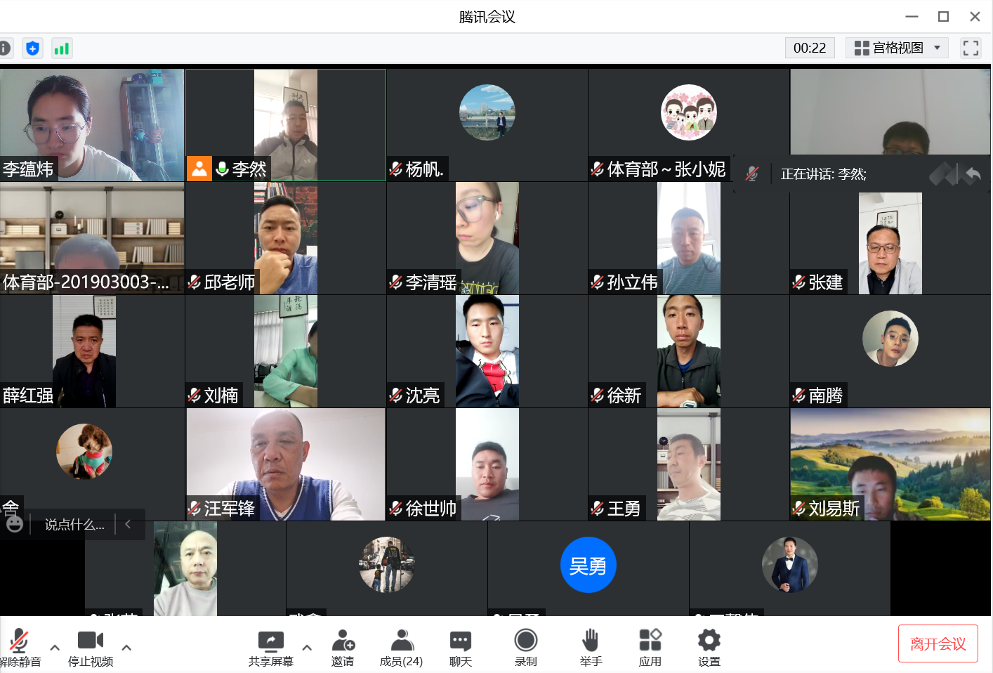 首先,李然传达了学校《关于开展2021-2022学年第二学期期中教学检查的通知》文件精神,对各项工作进行了安排,明确时间节点,细化落实到人。体育教学教研室主任薛红强对教学规范、教学运行、教学资料检查、调停课制度等工作提出了要求,重点强调了对未返校学生进行线上辅导,以及学生课外“自由跑”规则修改的通告。