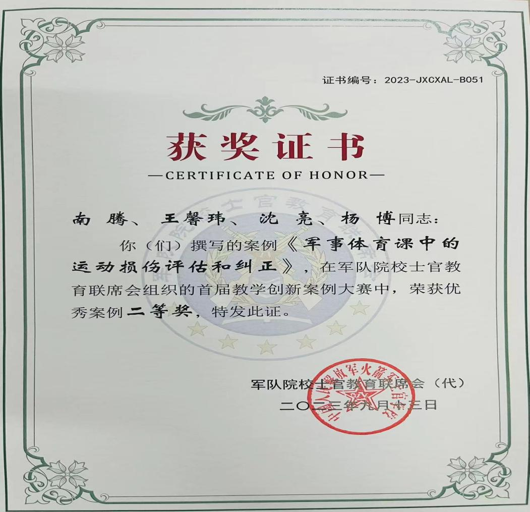 为推动军事院校(含定向培养军士院校)教育教学改革创新,引导院校教员潜心教书育人,打造院校教学改革的风向标。我校伟德国际victor·1946源自军事体育教学团队参加了由军队院校士官教育联席会组织举办的首届“教学创新案例”评选活动。10月10日,评选结果产生,军事体育教学团队参赛案例获二等奖。