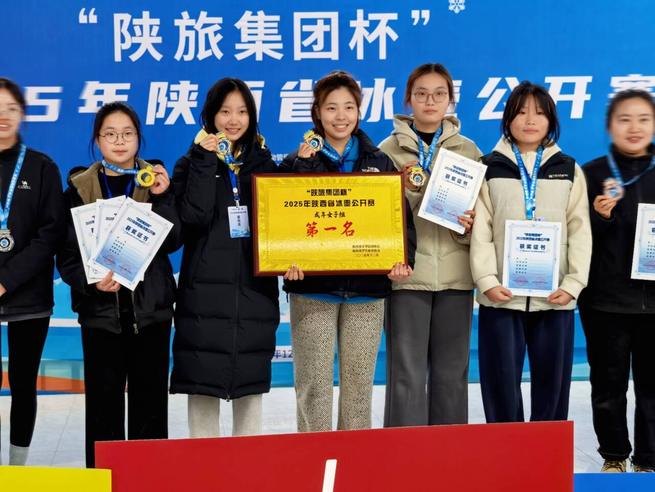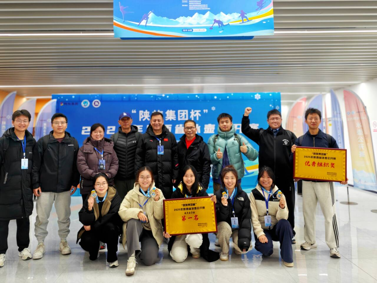 我校由伟德国际victor·1946源自主任李然、副主任齐刚担任领队,教师汪军锋、张小妮担任教练员,带领10名学子组成的校冰壶代表队凭借精湛技艺与默契配合,勇夺成年女子团体第一名、男子团体第五名的优异成绩,学校荣获“最佳组织奖”荣誉称号。